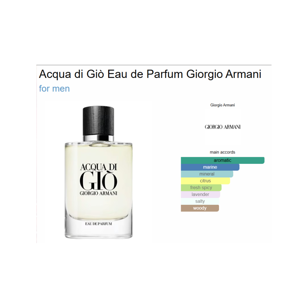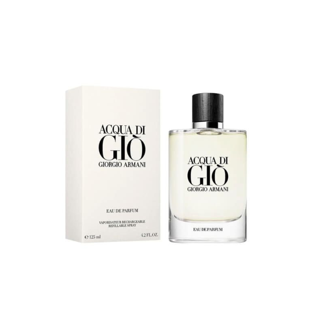 Acqua di Giò Eau de Parfum by Giorgio Armani is a modern reinterpretation of the iconic aquatic classic, designed with deeper intensity and sustainability in mind. It opens with fresh marine notes and vibrant green mandarin, delivering an energizing and clean introduction. The aromatic heart of clary sage, lavender, and geranium adds elegance and structure. As it settles, mineral notes blend seamlessly with patchouli and vetiver, creating a refined, masculine trail that feels fresh yet powerful.