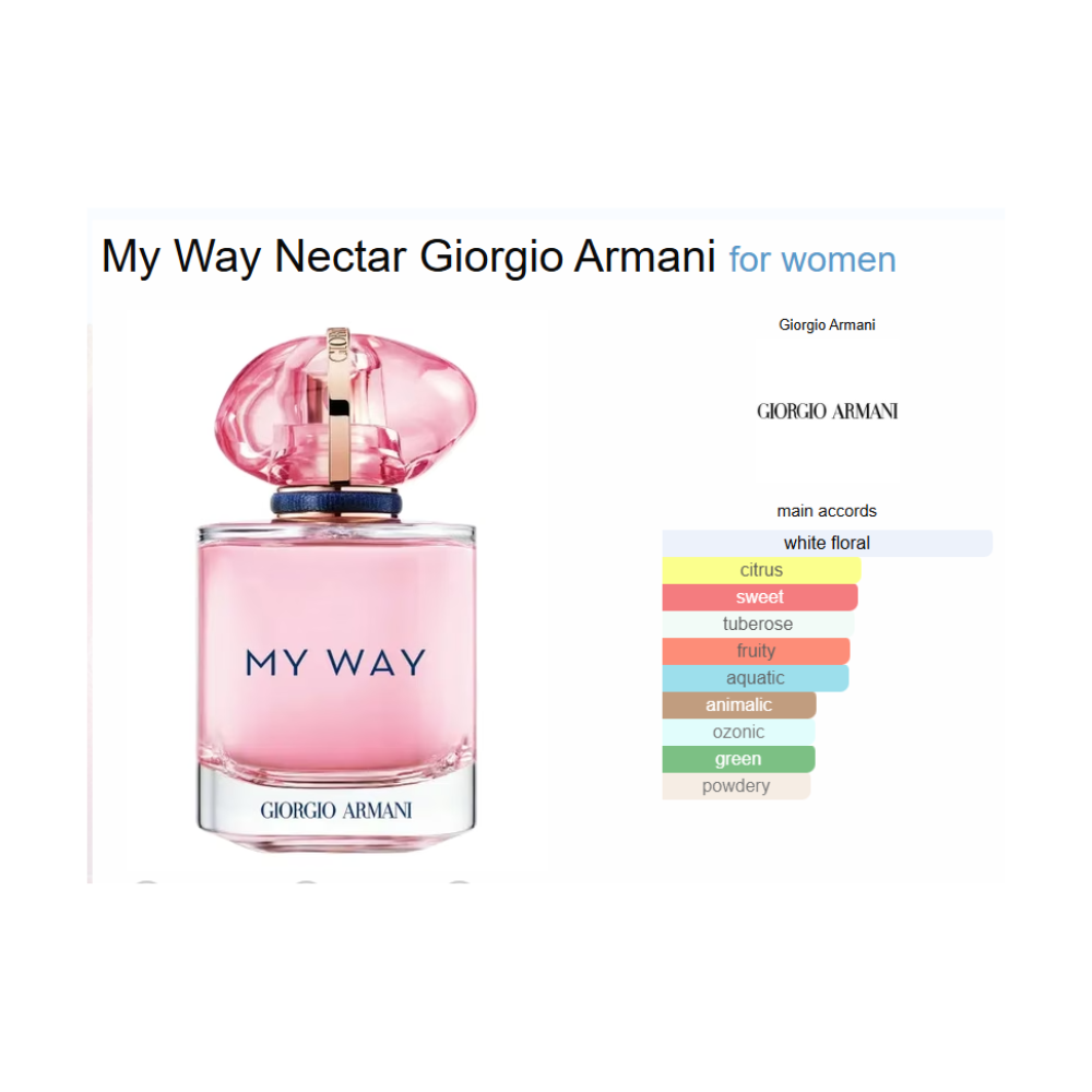 My Way Nectar Eau de Parfum by Giorgio Armani is a luminous and fruity interpretation of the My Way collection. It opens with juicy pear accord blended with fresh Calabrian bergamot and radiant orange blossom, creating a bright and addictive introduction. The heart reveals creamy tuberose and jasmine enhanced by a subtle green touch of violet leaf. As it settles, warm bourbon vanilla, soft white musk, and cedarwood form a smooth, elegant base that lingers beautifully on the skin.