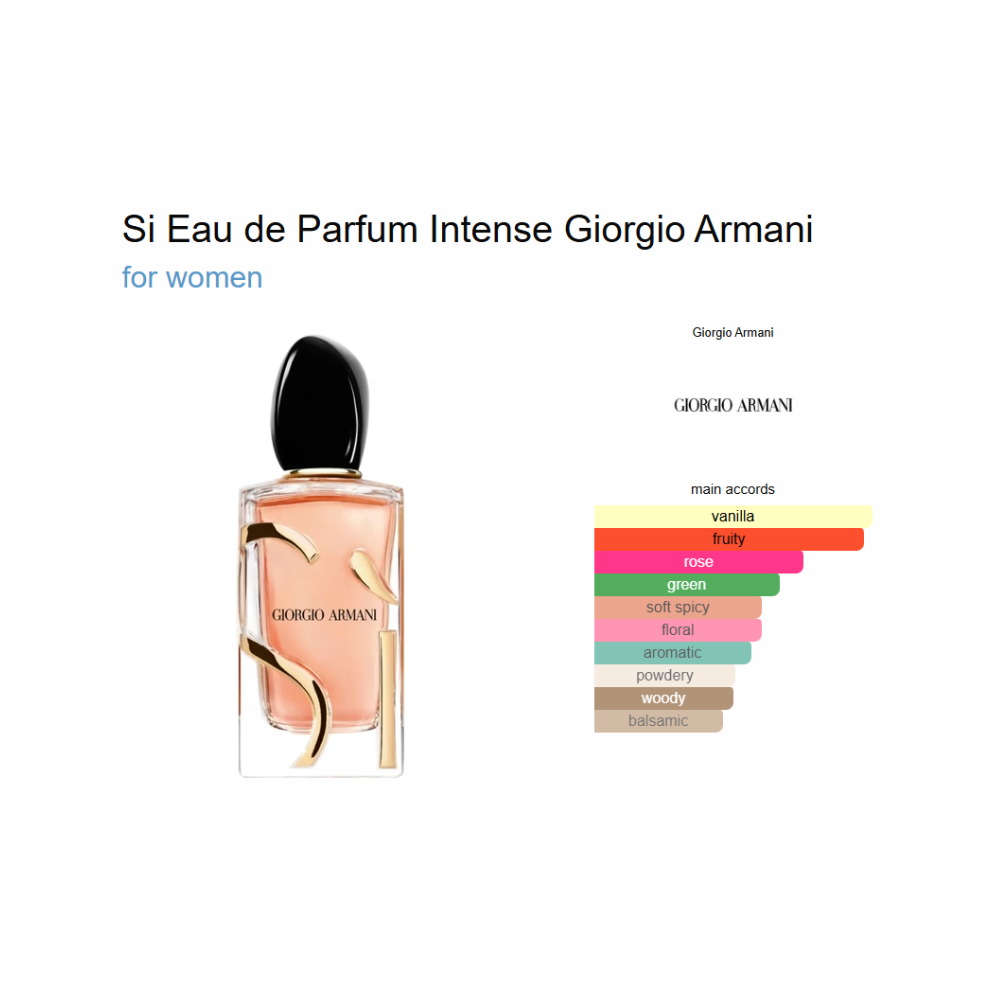 Sì Intense Eau de Parfum by Giorgio Armani is a deeper, more sensual interpretation of the iconic Sì signature. It opens with rich blackcurrant nectar, delivering a luxurious fruity intensity. The heart reveals elegant damask rose blended with davana, adding warmth and depth. As it settles, bourbon vanilla, patchouli, and benzoin create a creamy, amber-rich base that lingers with confidence and sophistication.