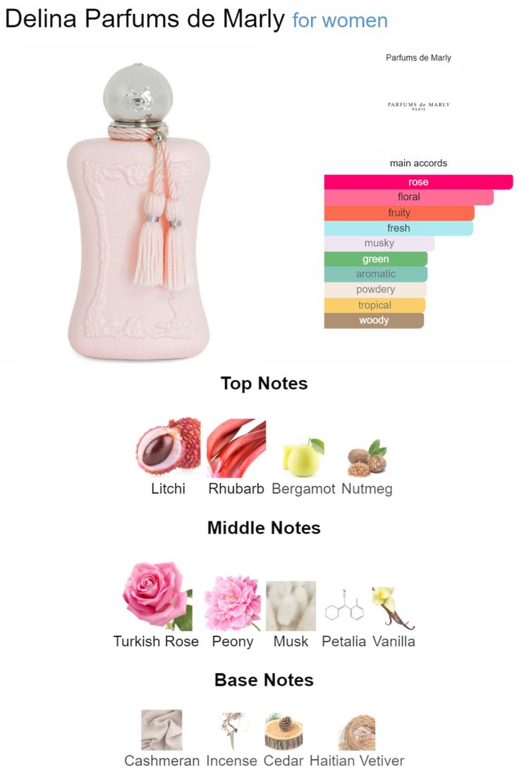 Parfums de Marly Delina Eau de Parfum is an exquisite, modern floral fragrance that captures the essence of femininity and grace. It opens with a burst of juicy lychee and rhubarb, creating a bright, lively introduction. The heart reveals an elegant bouquet of Turkish rose and peony, enriched by creamy vanilla and soft musk. The dry down brings warmth with cedarwood and cashmeran, adding depth and sophistication. Fresh yet sensual, Delina is a true signature scent — radiant, romantic, and irresistibly captivating.